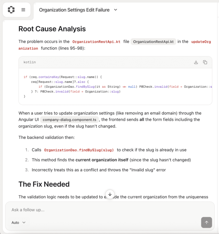 PlayerZero的中枢是他们所谓的WorldModel(天下模子),这是一个险峻文图,将每次代码改革、可不雅测性事件、营救工单和昔日的事故阿谀成一个单一的活扣构。当bug出当前,PlayerZero将其追忆到确凿的代码行,生成树立,并通过Slack将其路由给负责的工程师,只需轻触一下即可批准。从检测到树立的轮回在几分钟内自主运行。每个已措置的事故王人会永远响应到WorldModel中,因此下次雷同代码发布时,系统照旧知说念前次出了什么问题。