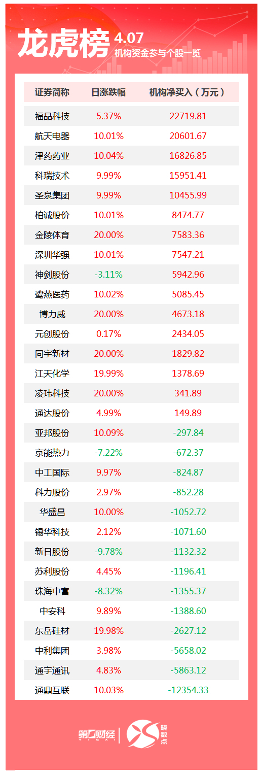 当天机构净买入前三的股票辞别是福晶科技、航天电器、津药药业,净买入金额辞别是2.27亿元、2.06亿元、1.68亿元。