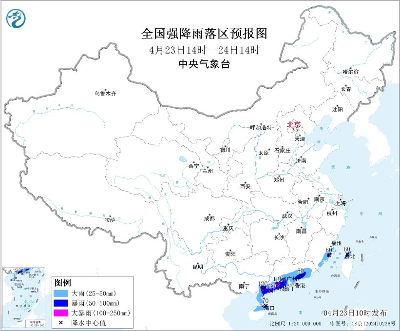 中央表象台4月23日10时持续发布暴雨蓝色预警: