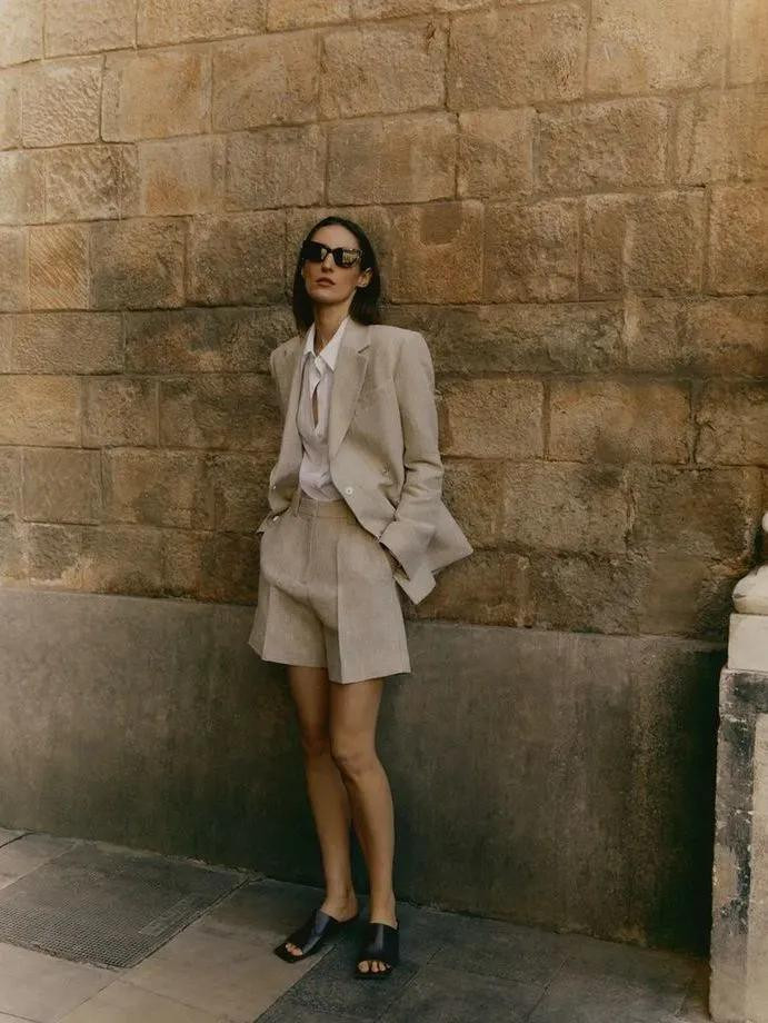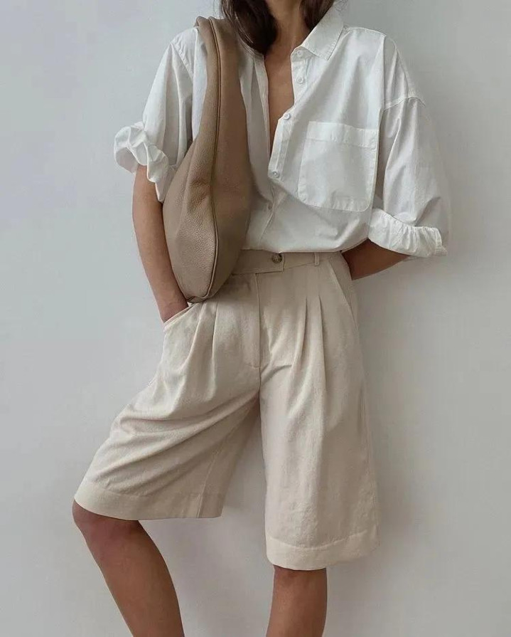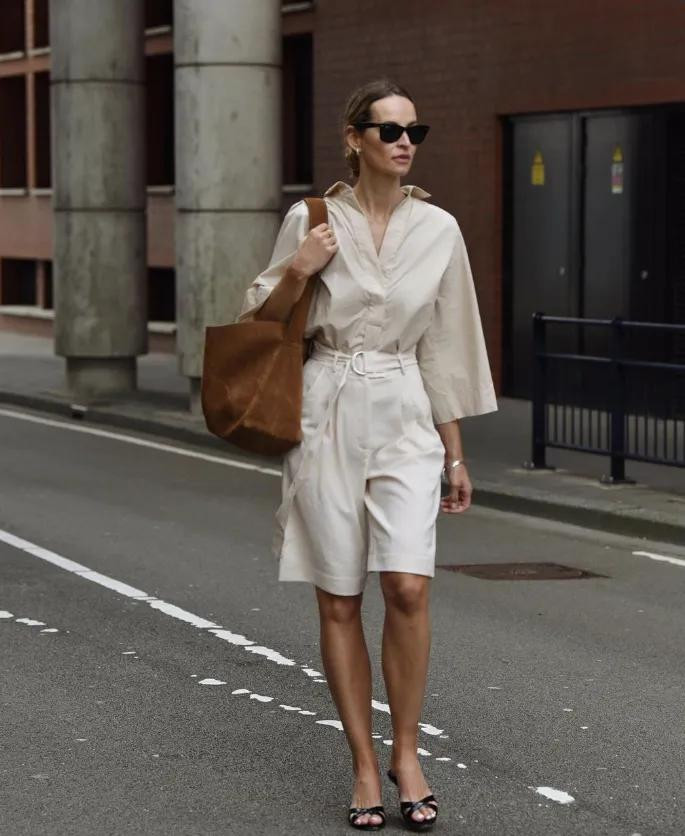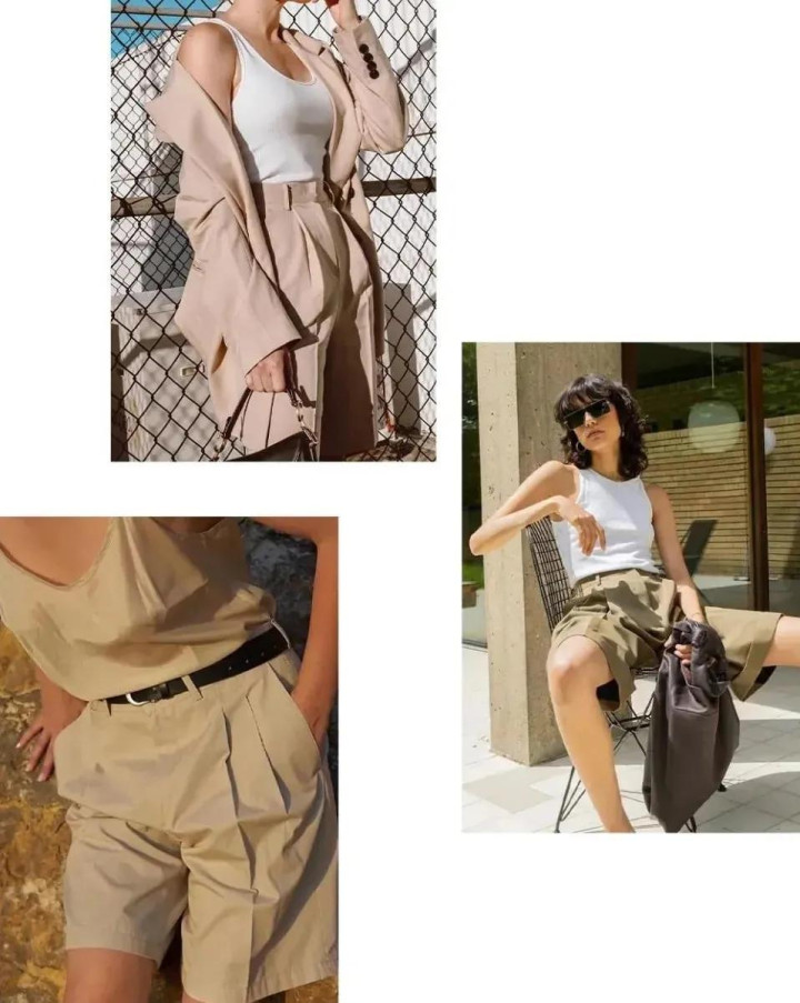 职场女性应该常备一条西装短裤,垂感的羊毛混纺材质,中腰直筒的表情,搭配同材质的衬衫或者修身的西装外衣。