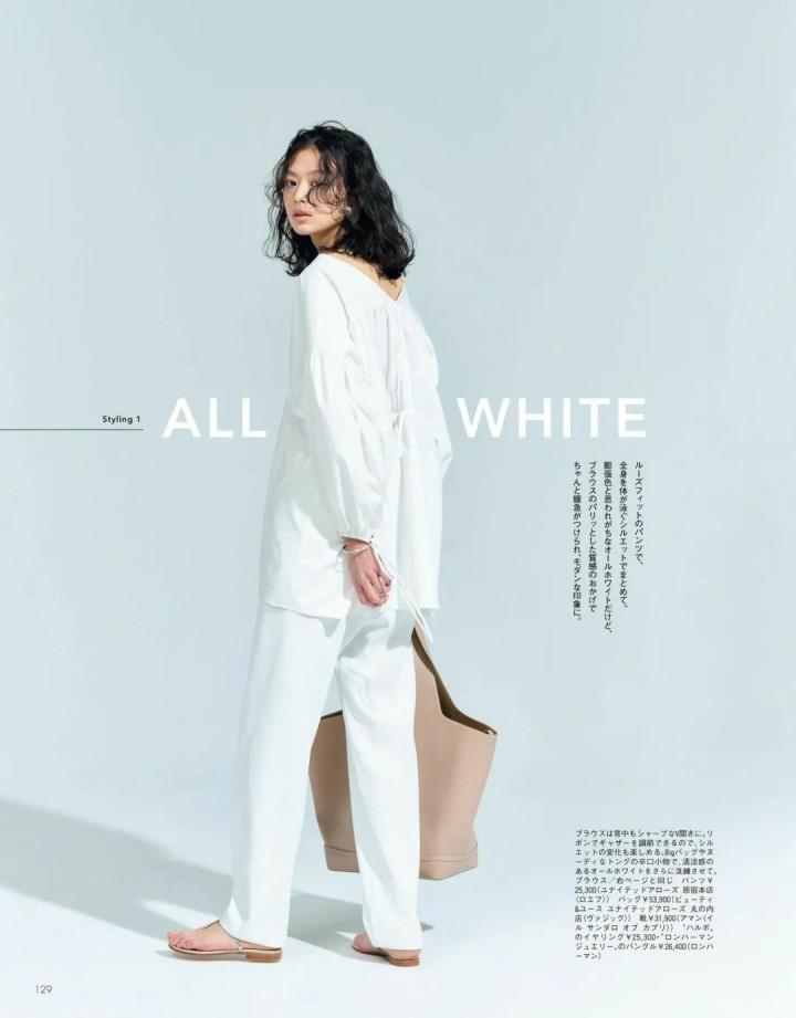 真丝衬衫垂下来的技艺很有动感、亚麻长裤皱巴巴的但看着挺当然、棉质T恤摸起来还挺柔嫩的,白色之是以显得高等,恰是因它不掩质料。