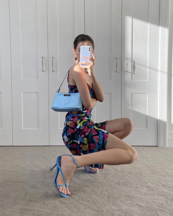 细带凉鞋配真丝吊带裙,则是晚风拂逾期,少许不动声色的柔媚。